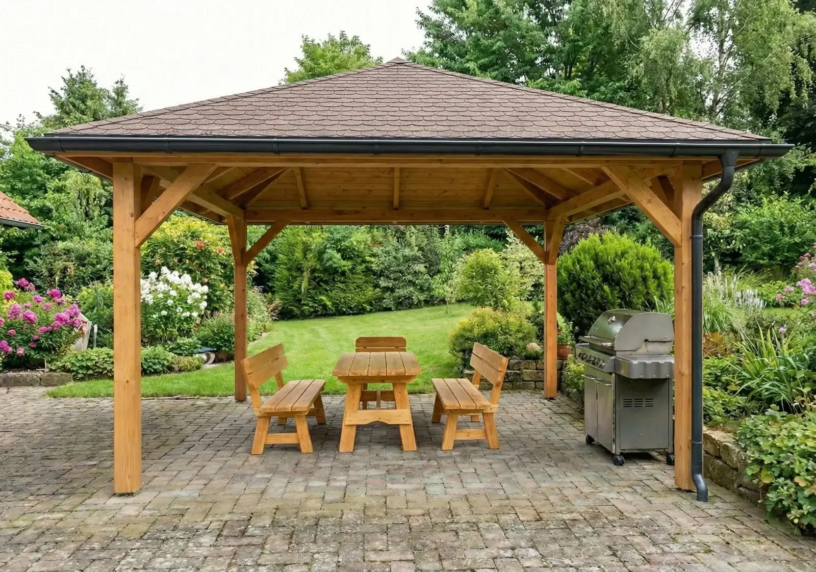 Tato stříška není povinná, ale dodává altánu elegantní a funkční vzhled. Vhodná zejména pro altány s grilem nebo otevřeným ohništěm.