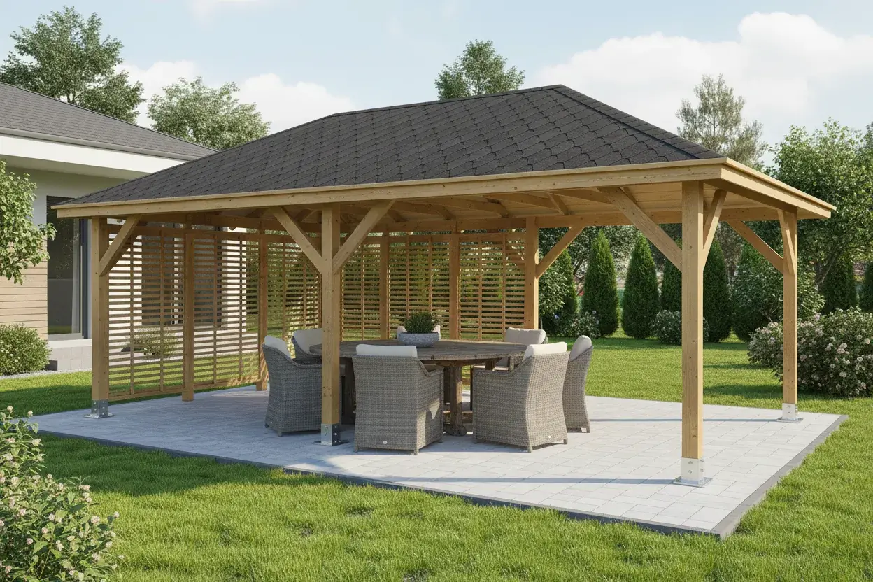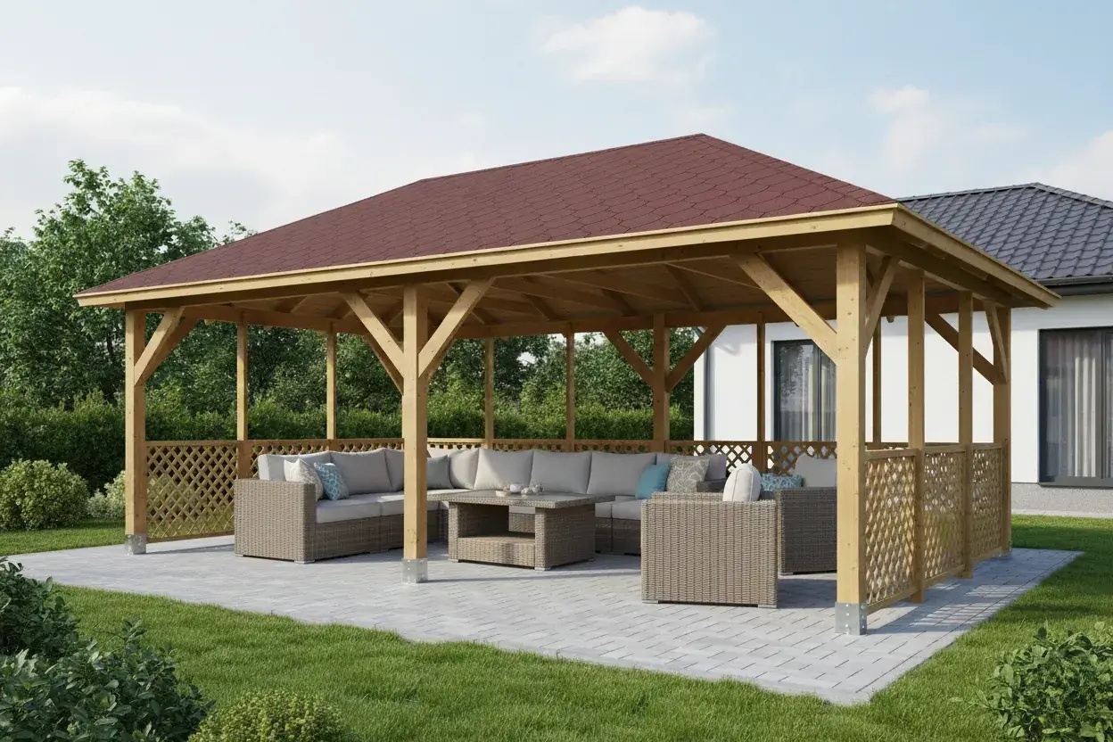 Tato stříška není povinná, ale dodává altánu elegantní a funkční vzhled. Vhodná zejména pro altány s grilem nebo otevřeným ohništěm.