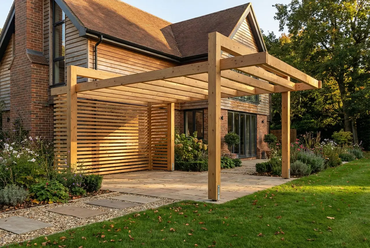 Moderní dřevěná pergola vyrobená z lepeného konstrukčního hranolu BSH představuje pevnou a estetickou samostatně stojící konstrukci do zahrady. Minimalistický design se hodí k moderním domům i klasickým zahradním úpravám.
