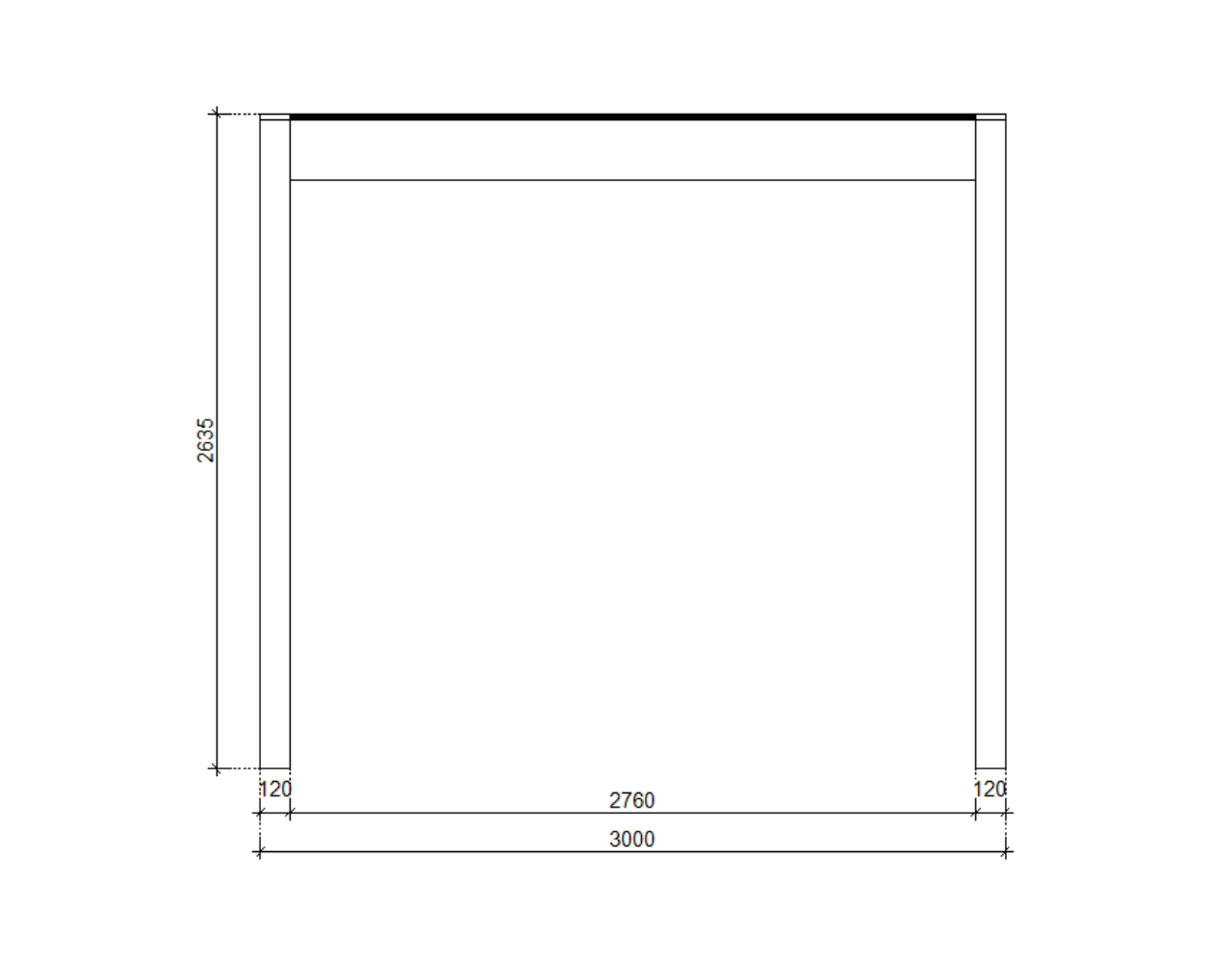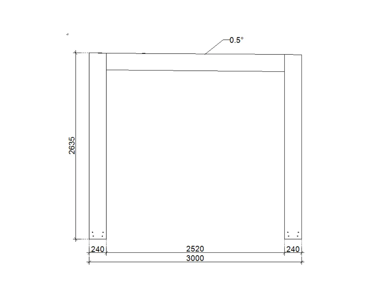 | Další rozměry | ● Krokve - 8x16 cm BSH ● Pozednice - 12x24 cm BSH ● Výška průchodu: 240 cm ● Celková výška: 265 cm ● Sklon střechy: 0,5⁰ |