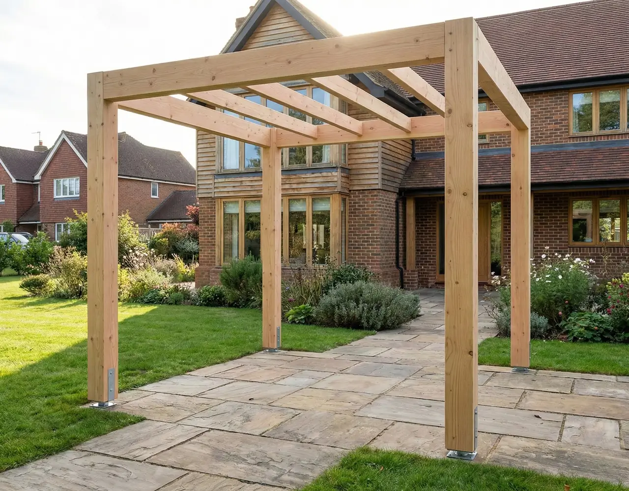 Moderní dřevěná pergola vyrobená z lepeného konstrukčního hranolu BSH představuje pevnou a estetickou samostatně stojící konstrukci do zahrady. Minimalistický design se hodí k moderním domům i klasickým zahradním úpravám.
