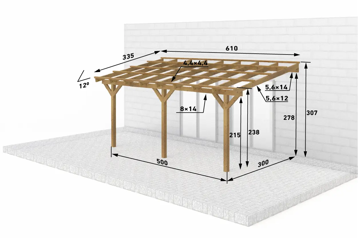 | Další rozměry | ● Krokve: 5,6x14 cm (BSH) ● Pozednice: 5,6x14 cm (BSH) ● Střešní latě: 4,4x4,4 cm |
