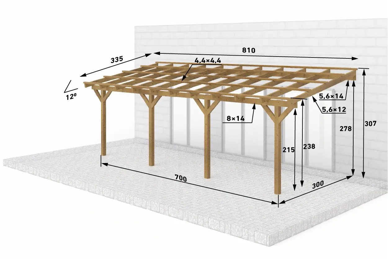 | Další rozměry | ● Krokve: 5,6x14 cm (BSH) ● Pozednice: 5,6x14 cm (BSH) ● Střešní latě: 4,4x4,4 cm |