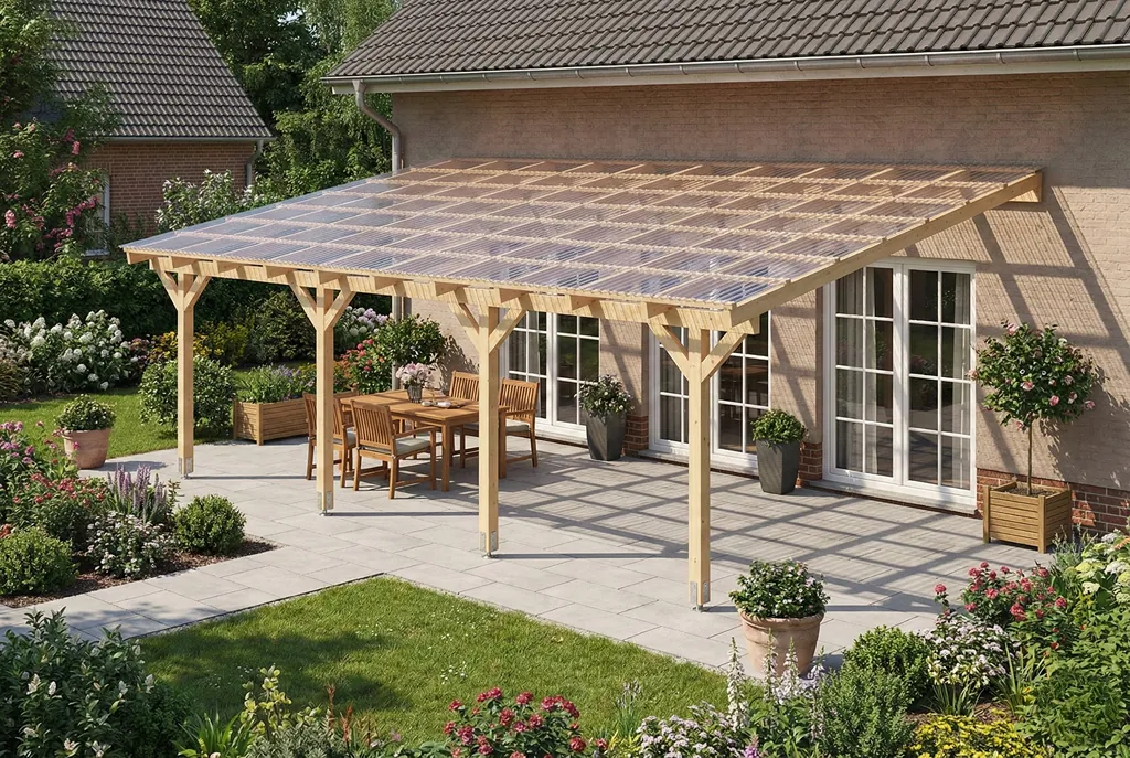 Naše pergola je ideálním řešením, pokud hledáte stabilní a elegantní zastřešení terasy. Nejlépe se hodí zastřešení z transparentních polykarbonátových desek (komůrkový polykarbonát), můžete však použít také libovolné vlnité nebo trapézové desky – podle vašeho vkusu.