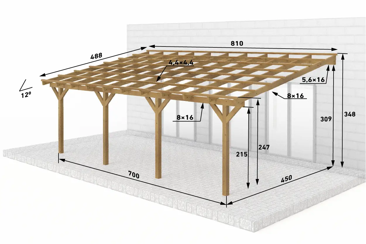 | Další rozměry | ● Krokve: 8x16 cm (BSH) ● Pozednice: 8x16 cm (BSH) ● Late: 4,4x4,4 cm |