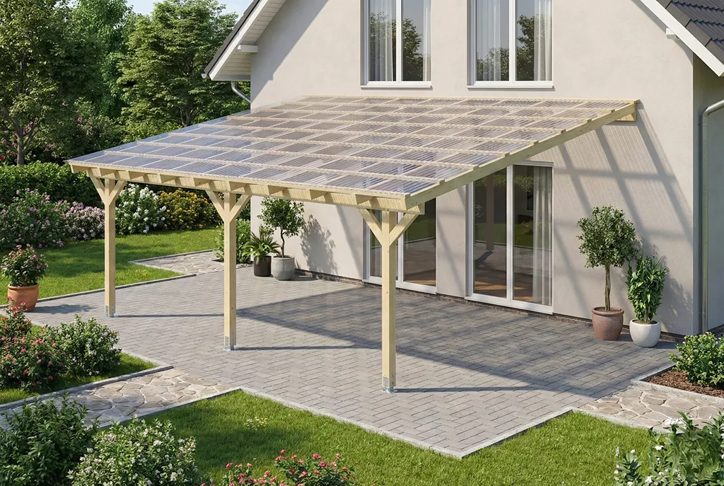 Naše pergola je ideálním řešením, pokud hledáte stabilní a elegantní zastřešení terasy. Nejlépe se hodí zastřešení z transparentních polykarbonátových desek (komůrkový polykarbonát), můžete však použít také libovolné vlnité nebo trapézové desky – podle vašeho vkusu.