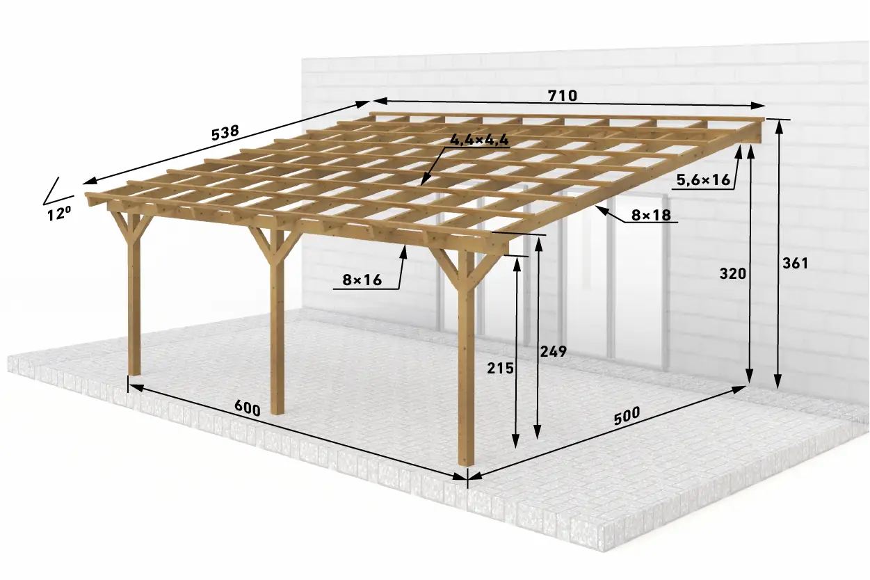 Dřevěná pergola ke zdi domu 600x500