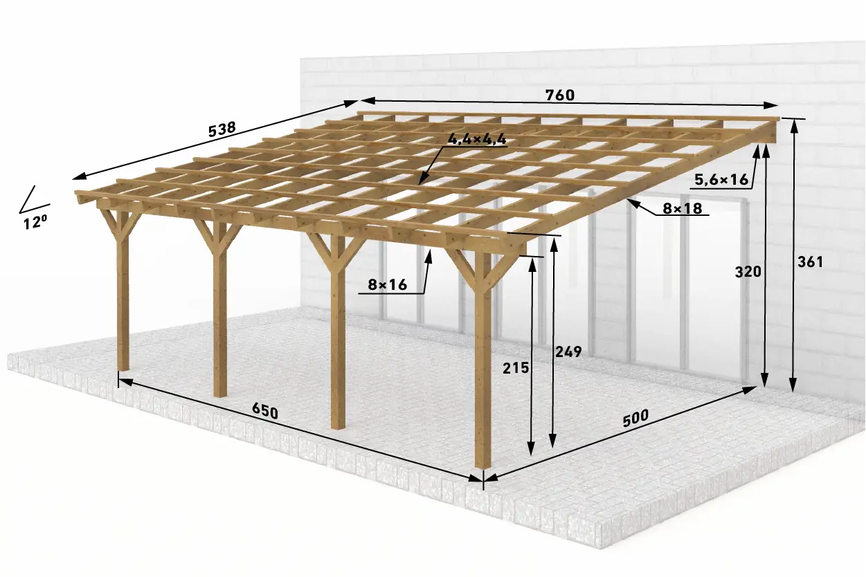 Dřevěná pergola ke zdi domu 650x500